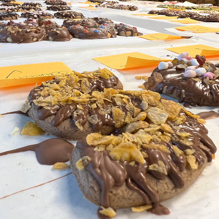 Dafür haben wir eine Website mit einem Online-Cookie-Konfigurator programmiert, mit welchem unsere Kund:innen ihr Custom-Cookie zusammenstellen konnten. Zur Auswahl standen verschiedene Teige und Glasuren, sowie unterschiedliche Topping-Optionen, wie Karamellwürfel, Mini-Marshmallows, Smarties, Gummibärchen oder sogar Sriracha-Sauce oder Essigchips für die Experimentierfreudigen. So trafen die unterschiedlichsten Cookie-Bestellungen bei uns ein.